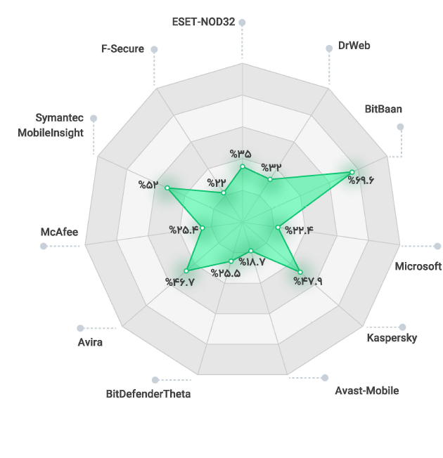در نمودار روبرو دقت تشخیص هر آنتیویروس در زمان اسکن اولیه برنامهها قابل مشاهده است.
