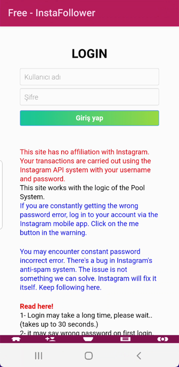 بررسی یکی از این اپلیکیشنها نشان میدهد که ابتدا از کاربر خواسته میشود شناسه و پسورد حساب کاربری اینستاگرام خود را وارد کند تا اطلاعات او با API اینستاگرام بررسی شود که ادعایی دروغ است و اطلاعات لاگین توسط مهاجم ذخیره میگردد.
